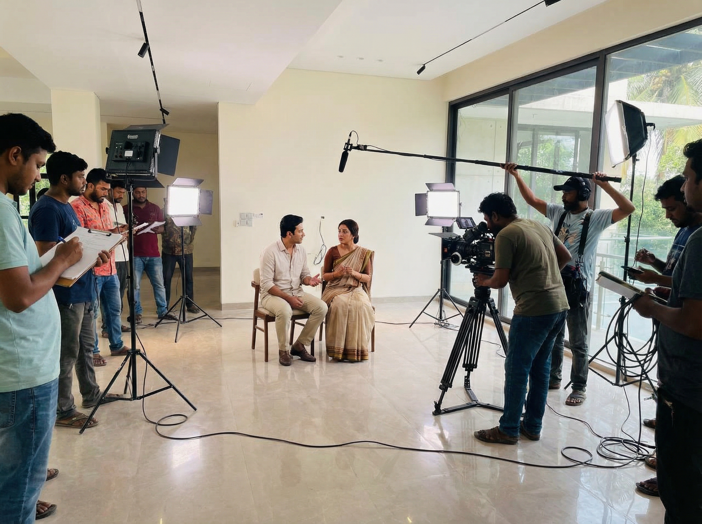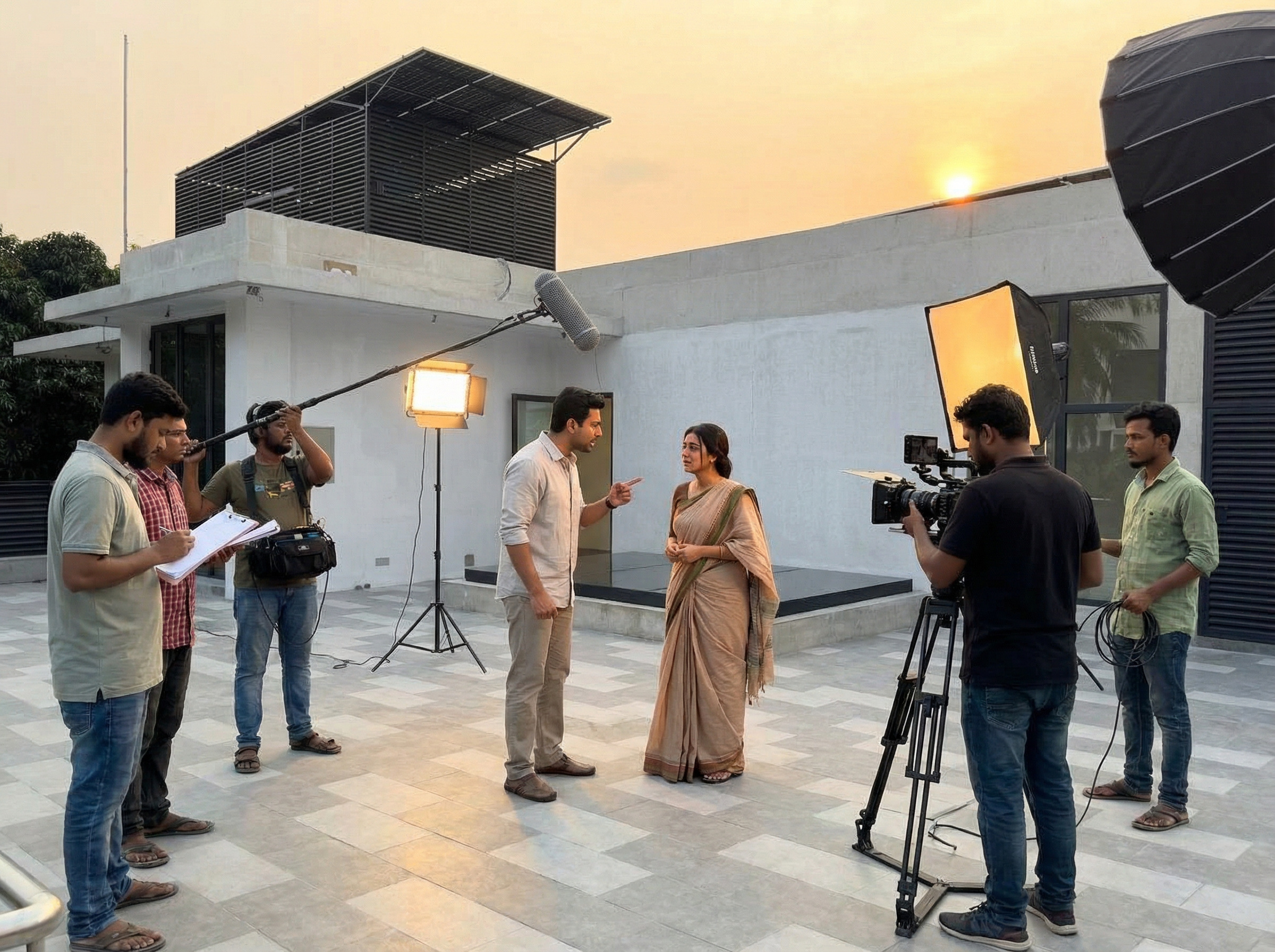 Inspired by the Bengali letter “Sha” (স), our architectural footprint creates dynamic angles and secluded pockets of light that change throughout the day. This allows directors to shoot multiple scenes in a single location without repetitive backgrounds.